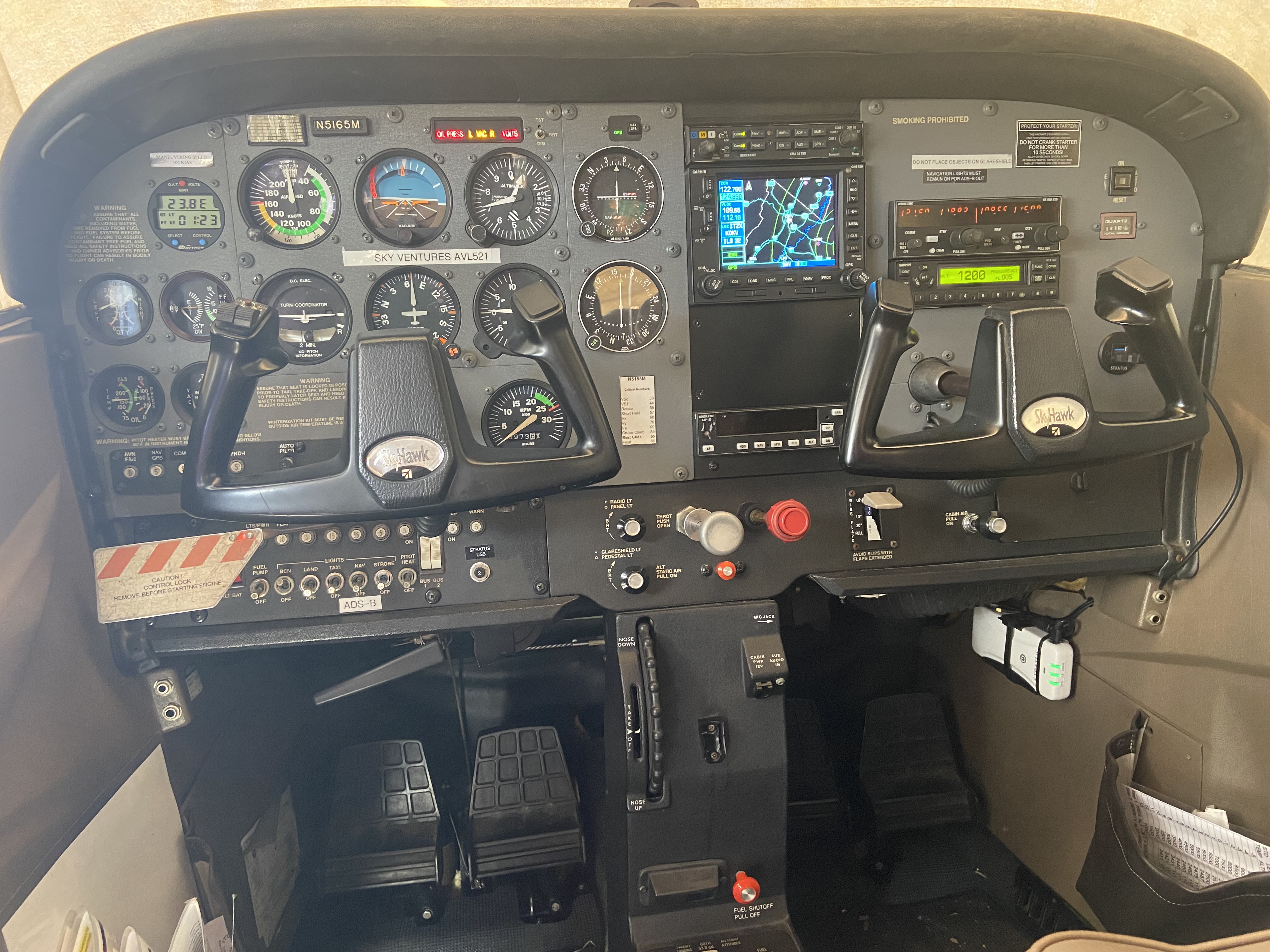N5165M is officially a Cessna 172R, but with the upgraded engine and propeller it might as well be an "S" model. The 180 horsepower is now able to carry the full 2550 pounds of maximum take off weight, just like a C172S. In the panel you will find a Garmin G530 with WAAS capability. The KAP140 autopilot can be a great resource to manage your workload. Below the panel on the lower right hand side there is also a "hidden" stratus for all of you who fly with an iPad and pick up the incoming traffic. This additional safety feature is worth its weight. So, if you prefer to learn to fly the "steam gauges" N5165M will do you just right. The extra capability in horsepower and weight, combined with the standard "long range" fuel tanks, could carry you further and keep you in the air longer than your bladder will. A great basic trainer and a capable instrument platform for local "hamburger" runs or longer cross country flights to get an ice-cream cone at the beach.