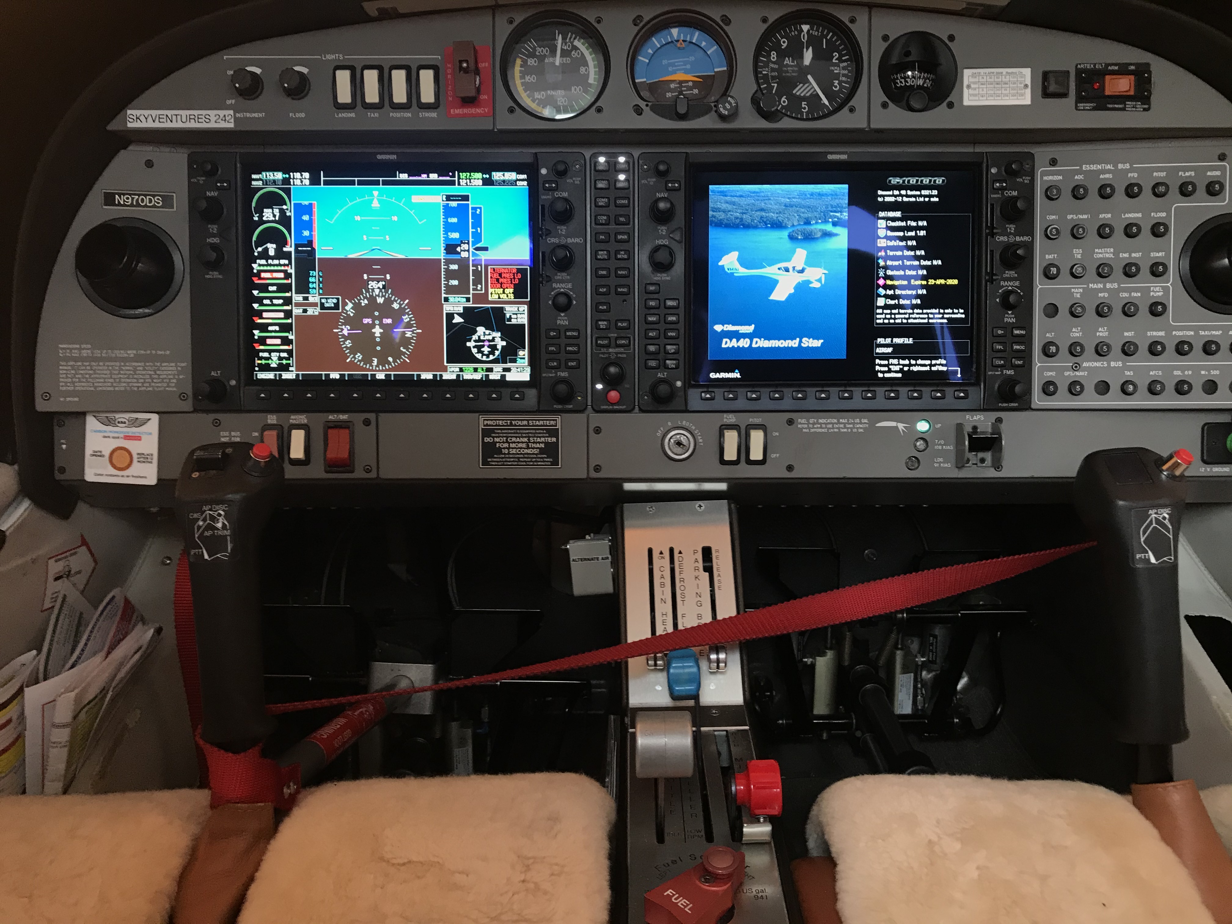 Finally the Diamond Star has returned to the Aviation Adventures rental fleet. This 2008 DA-40 is equipped with the Garmin G1000, including an integrated GFC700 auto pilot and flight director. It is your choice to use it, or fly the plane by hand and feel the stick and responsiveness of this modern composite aircaft. The three bladed MT composite propeller keeps this noise level down. The extended baggage compartment reaches all the way into the tail section to facilitate your skis. The visibility from the cockpit is like being in an IMAX theater, and the ADS-B in and out displays traffic and weather on the big MFD screen. If you have not flown the slick looking, but very easy to fly Diamond aircraft yet, you should consider it to try something new. The airplane is an excellent cross country aircraft but is also perfectly equipped for instrument training. And by the way, being comfortable with interior layout of the DA-40 and its flying characteristics, makes for a smooth transition into the multi-engine version, DA-42, for your next challenge.